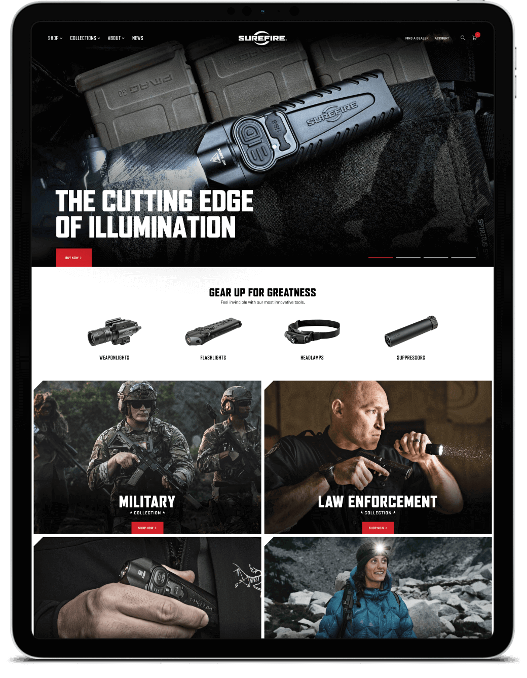Looking for a new and bolder online presence, SureFire enlisted us to help upgrade their web and digital platform with a new e-commerce website. Starting with site architecture, we created a smoother, more streamlined customer experience from product search to final checkout. At the design stage, we created a bold, new look that showcases SureFire’s products and aligns with its core essence as serious tactical gear.